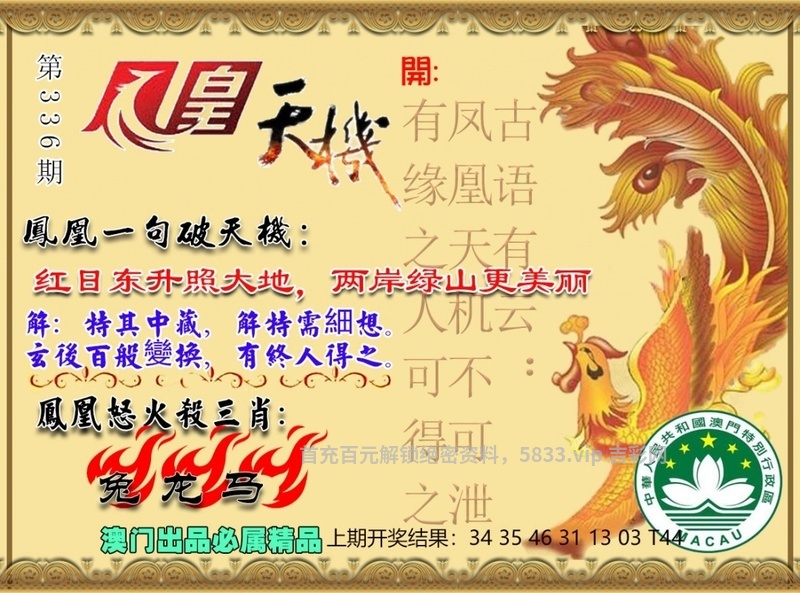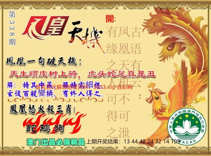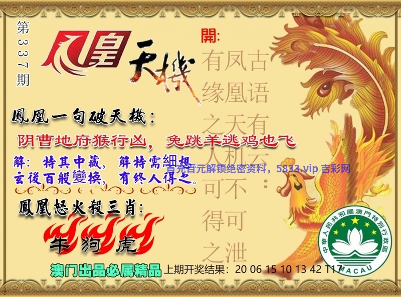 | 335期:凤凰一句破天机:一人拾柴火不旺,众人拾柴火焰高 七尾中特:0123458 绝杀一肖:龙肖 平特一尾:333尾 |