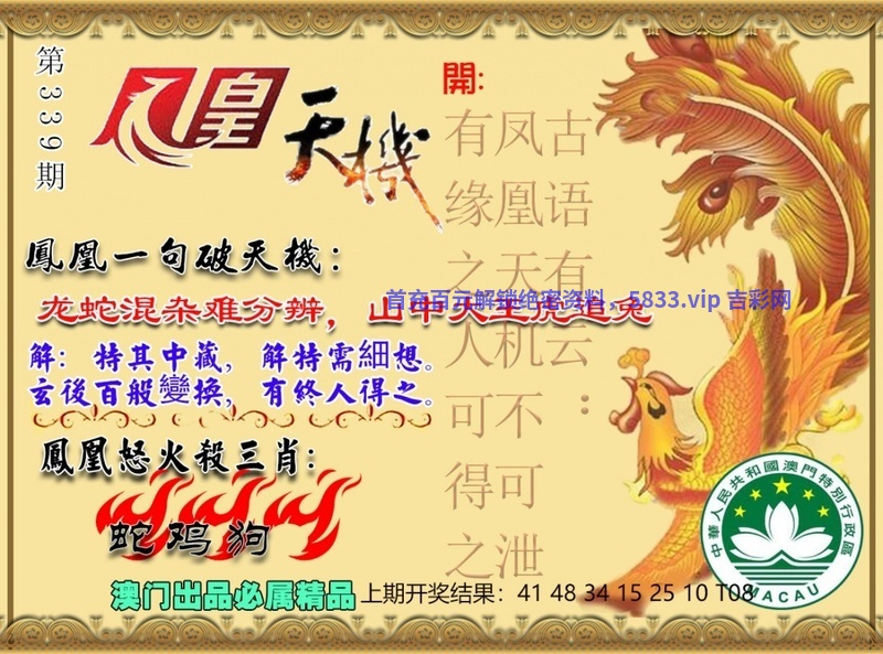 | 339期:凤凰一句破天机:龙蛇混杂难分辨,山中大王虎追兔 六肖中特:马狗鼠龙牛猴 四肖中特:马狗鼠龙 七尾中特:1345689 绝杀一肖:蛇肖 |